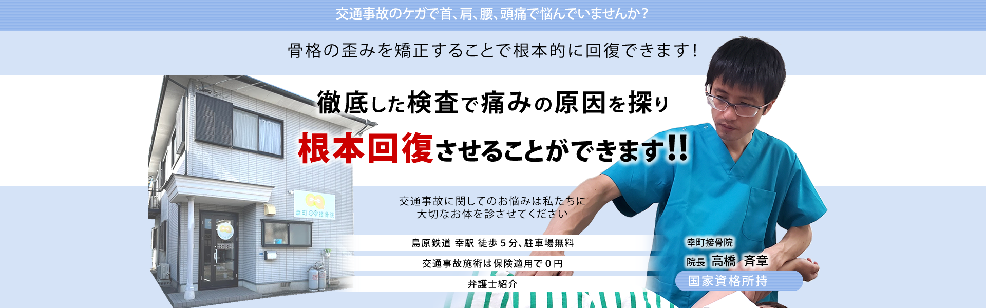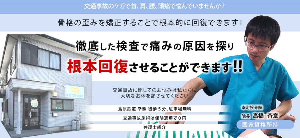 幸町接骨院は、交通事故に遭われた方の救済を1番に考えて、施術や対応に力を入れております。経験年数が10年以上の国家資格を有した施術家が対応しますので、安心しておまかせください。